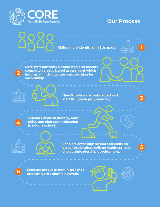 What is a “Theory of Change”? Essentially it provides an illustration of how and why a desired change can be expected to happen. In this Theory of Change model you can see how our stakeholders, inputs, and outputs lead to meaningful outcomes that grow from our work to educate, enrich, and empower CORE Scholars and families.